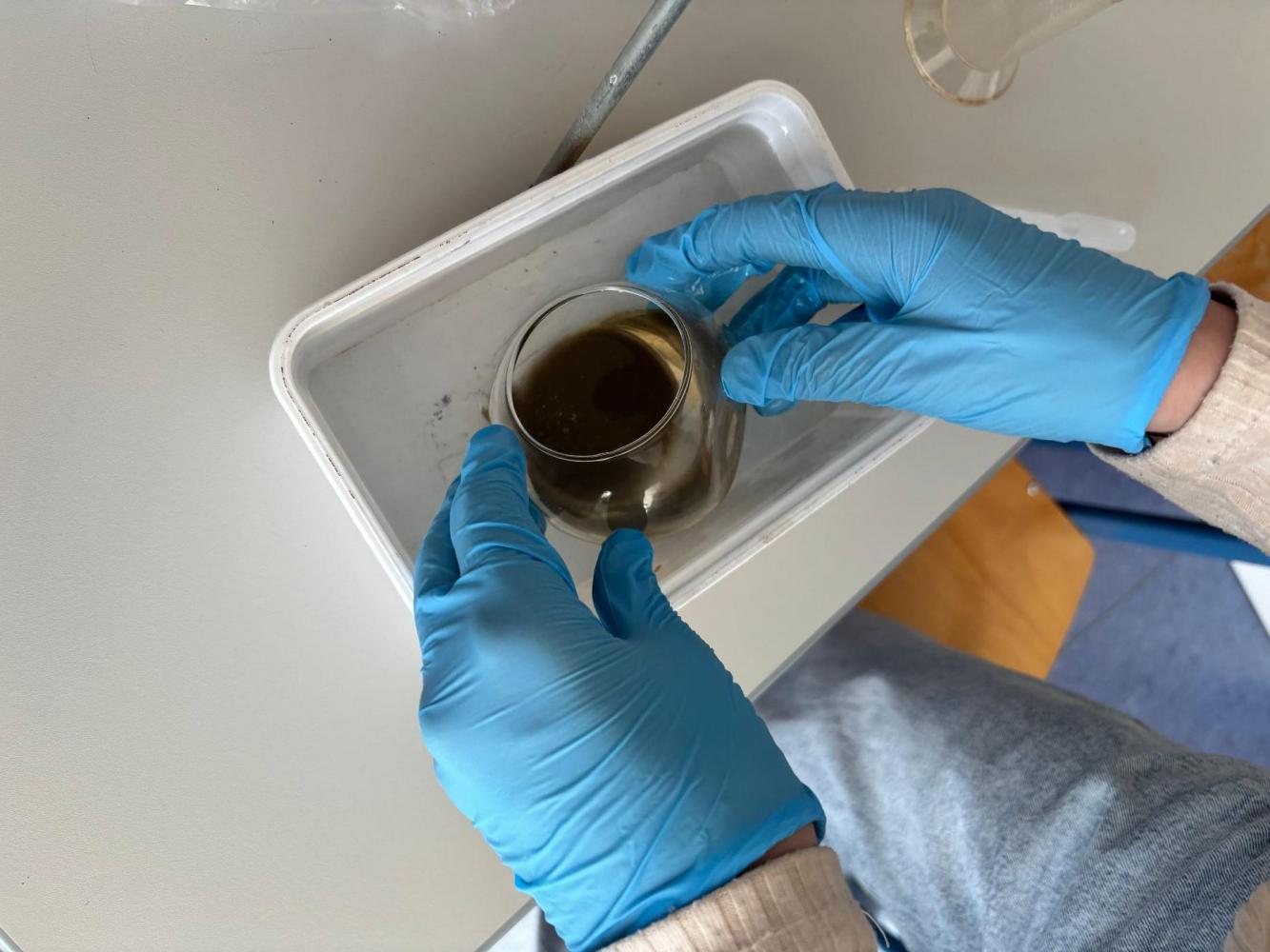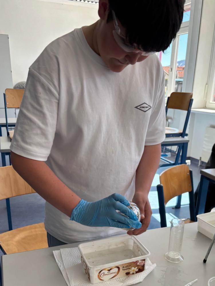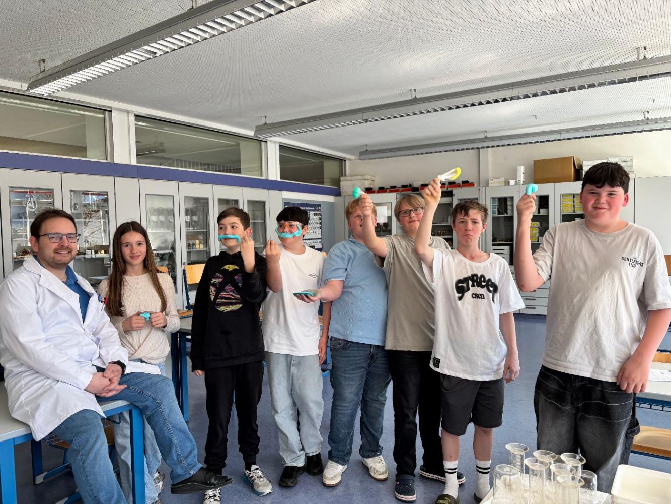 Ein weiterer Teil des Workshops war die Herstellung von Springknete. Dabei konnten die Schülerinnen und Schüler beobachten, wie sich die Eigenschaften eines Stoffes durch chemische Vernetzung verändern – von einer flüssigen Ausgangssubstanz hin zu einer elastischen, formbaren Masse. Ein Experiment, das nicht nur funktionierte, sondern auch sofort ausprobiert wurde.